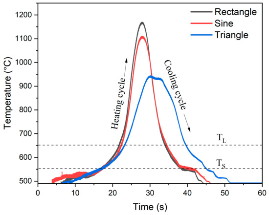 The solidification behavior and microstructural evolution of alloys during welding processes can be better understood by analyzing the heating and cooling curves. The cooling curves play a vital role in optimizing process parameters and regulating the microstructure of the end product, specifically in the case of GTAW-based WAAM. The temperature of the substrate was monitored during the deposition process by employing an IR pyrometer. The measurement point was set at a distance of 5 mm away from the deposition zone. The temperature profile was obtained for the five-layered wall, the pyrometer readings were taken for every layer for each waveform, and their average was plotted, as illustrated in Figure 4. As the deposition started, the temperature of the measurement point on the substrate rose and attained a maximum as the electric arc approached the point (heating cycle). Subsequently, the temperature started to decrease as the electric arc moved past that point (cooling cycle). The TS and TL correspond to the solidus and liquidus lines for the 4043 Al-alloy [27]. The rectangular waveform had the maximum average peak temperature of 1164 ± 64 °C followed by sinusoidal (1049 ± 56 °C) and triangular (960 ± 38 °C). Also, the peak temperature for each waveform was much higher compared to the melting point of aluminum. This is attributed to the oxide formation on the wall, which required high temperatures for melting [28]. The average cooling rate was determined by averaging the slopes of the temperature–time curves in the cooling cycle region (between TS and TL) at uniform intervals [29]. The calculated average cooling rate of the rectangle waveform was 23.3 ± 2 °C/s; for the sinusoidal waveform, it was 22.4 ± 1.5 °C/s, and for the triangle waveform, it was 17.75 ± 2 °C/s. The variation can be attributed to their corresponding RMS current value that contributed to the heat input, which is governed by the equation , where H is the heat input per unit length, η is the heat transfer efficiency, I is the RMS current, V is the voltage, and is the scanning speed [29].