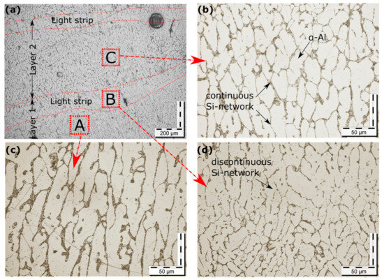 Microstructure of printed samples with different regions: (a) showing different layers separated by light strip, (b) magnified image of region C showing different phases present, (c) magnified image of region A showing columnar dendrites, and (d) magnified image of region B showing discontinuous Si-network.