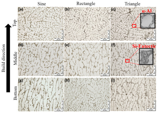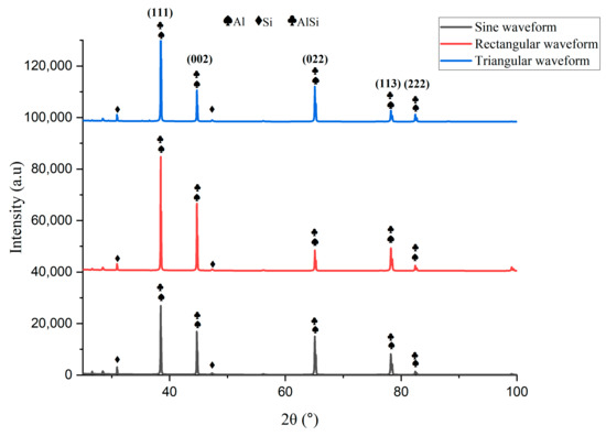 The microstructure of the printed sample in the WAAM process is greatly influenced by process parameters like welding current, voltage, scanning speed, shielding gas flow rate, and interlayer delay time [29]. The size and distribution of the precipitates within the printed component are controlled by the cooling rate [30]. The micrographs of the printed sample depicting different regions are presented in Figure 5a–d. The microstructure primarily consisted of α-aluminum and aluminum-silicon eutectic [31], as shown in Figure 5b. This eutectic surrounds α-aluminum, forming a continuous silicon network. Figure 5a clearly shows that the deposited layers are separated by a distinct light strip. This light strip is formed as a result of the grain boundary diffusion, which causes the formation of a discontinuous silicon network during the deposition of subsequent layers [14], as presented in Figure 5d. Figure 6a–i shows the optical micrographs of the transverse sections of the five-layered deposits, depicting evolution in the microstructure in the build direction, with a coarser grain structure at the bottom, and fine at the top. This heterogeneous grain distribution can be attributed to the non-uniform temperature distribution in the build direction. The presence of the two phases was confirmed by the X-ray diffraction (XRD) data, as seen in Figure 7. In addition, there was the formation of Al9Si intermetallic, which is consistent with the findings reported by other authors [32]. The crystallographic growth of α-aluminum and α-aluminum-silicon eutectic occurs predominantly along (111) direction. The low intensity of the silicon-rich phase in the XRD spectra is attributed to the low Si content of the alloy. The 6063 aluminum alloy substrate assisted in the epitaxial growth of the first layer [10], as can be seen in the bottom section of all the samples presented in Figure 6g–i. The line intercept method was employed to measure the grain size of the transverse cross-section printed samples [33]. The shape and size of grains are influenced by the relationship between the temperature gradient (G) and the solidification rate (R). The G/R ratio governs the grain morphology, while the product of G and R determines the grain size [23]. The grain structure was predominantly columnar dendritic at the bottom portion, with the maximum average grain size of 80 ± 4 µm for the deposited section developed by rectangular waveforms, followed by sinusoidal (49 ± 2 µm) and triangular (45 ± 2 µm). The middle section exhibited a slightly smaller grain size than the bottom, with size ranging from (41 ± 4 µm) for rectangular waveforms to (39 ± 2 µm) for sinusoidal and (36 ± 2 µm) for triangular. At the same time, the top portion of all the deposited sections exhibited an equiaxed grain structure with an average grain size of nearly 25 ± 6 µm. A similar trend was reported by Lyu et al., which they attributed to the corresponding cooling rate [34].