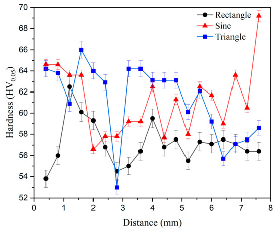 Vickers microhardness test was carried out for all the deposits as per the standards [21], and its variation in moving from top to bottom is presented in Figure 8. The hardness was measured at an interval of 0.4 mm in moving from top to bottom (i.e., opposite to the build direction). There appears to be a pattern in the hardness of all the deposits, i.e., the values being somewhat higher at the top than those at the bottom, which is attributed to the difference in the average grain size at the top and bottom. Also, the erratic nature of hardness values depends on whether the indent is primarily on the α-aluminum or on the eutectic silicon phase; the latter has a higher hardness [35]. The average hardness value was maximum for triangular (63 ± 3 HV0.05) and minimum for rectangular (57 ± 2 HV0.05) waveform. This difference in hardness can be attributed to their respective average grain sizes. Since finer grains typically have a greater number of grain boundaries, this impedes the movement of dislocations more effectively than coarser grains [29].