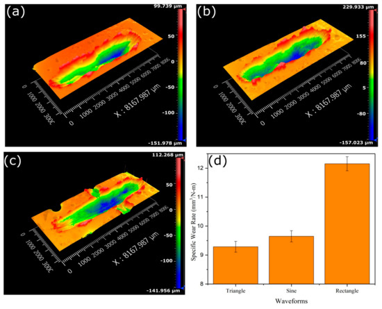 Surface profile of the worn surface: (a) sinusoidal, (b) rectangular, (c) triangular and (d) specific wear rate.