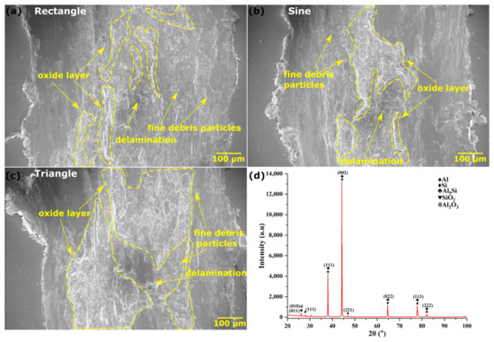 (a–c) SEM image of the wear track of rectangular, sinusoidal, and triangular wave patterns, respectively, and (d) XRD in the area of the wear track.