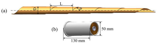 The winding and stabilization forming process was developed with consideration of the appearance configuration of the STACER component, the features of deploying action, and the necessary properties in practical applications for STACERs. The whole process can be divided into two continuous procedures: the winding procedure and stabilization procedure (vacuum heat treatment). The schematic plot of the specific equipment used for the winding procedure is shown in Figure 3. The mandrel was first gripped tightly in the three jaw chucks arranged at both ends of the mandrel cavity of the equipment; then, the kernel components were moved to the left side of the operation platform. The beryllium bronze strips were drawn out from the uncoiling shaft through the clearance of the guiding board and fixed on the mandrel, with the planar movement of the winding kernel components being set to a specific speed from left to right following the rotation of the lathe spindle driver, resulting in the beryllium bronze strips being wrapped around the mandrel with a constant helix angle (α), forming the preformed STACER. Preformed STACERs with different helix angles or diameters can be obtained by adjusting the feeding angle (α, as shown in Figure 3b) or alternating mandrels with different diameters. The vacuum heat treatment process was adopted for the stabilization procedure, in which the degree of the vacuum reached approximately 10−5 Pa to protect the components from oxidation. After the stabilization procedures, the beryllium bronze strips were gradually peeled from the mandrel, forming the final STACER components. A physical view of the STACERs is shown in Figure 4.
