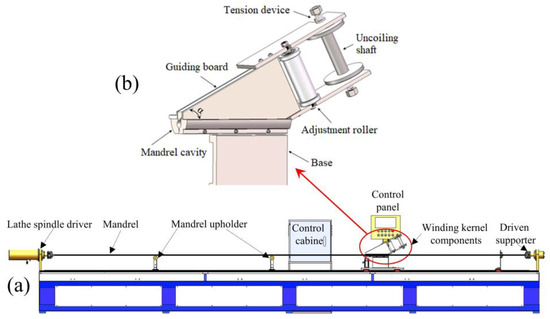 Schematic plot of specific equipment for the winding procedure. (a) Overall layout; (b) winding kernel component.