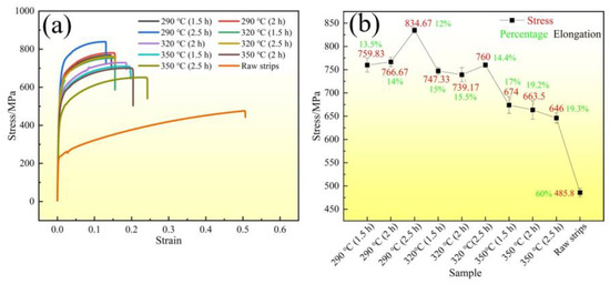 The room-temperature tensile experiment results are shown in Figure 7. The specimens were raw QBe2.0 strips and STACERs fabricated using different stabilization (heat treatments) conditions (290 °C, 320 °C, and 350 °C, with holding for 1.5 h, 2 h, and 2.5 h, respectively). The raw strips were in a quenched state (soft state), which made them easy to be formed into different shapes, the tensile strength was 485.8 MPa, and the elongation was 60%, exhibiting sound formability. For the STACERs subject to different heat treatments, with the increase in temperature from 290 °C to 350 °C, the tensile strength decreased gradually from 834.67 MPa to 646 MPa, and the elongation rate increased from 12% to 19.3%, as shown in Figure 7b. The QBe2.0 alloy was typical precipitation-hardened alloy; therefore, second-phase particle decomposition and precipitation occurred during the heat treatment process, the strips strengthened to a certain degree between approximately 160 MPa and 350 MPa, and the rising heat temperature coupled with the prolonging of the holding time weakened the strength and promoted plasticity [31], which implied that the precipitation process may have been finished, and the recovery and recrystallization phenomenon proceeded.