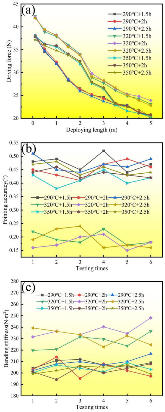 The driving force is a vital property for ensuring a sound STACER deployment process; then, the subsequent action and exploration process can be achieved. Stored strain energy serves as the effort needed to move the boom along its given path. The results of the driving force measurement are given in Table 2; the line and symbol graph is shown in Figure 9a. The table and the graph indicate that the driving force is more than 20 N, and with the increase in deploying length, the driving force decreases gradually from about 40 N to approximately 20 N. On the other hand, the STACERs stabilized under temperatures of 290 °C and 350 °C appeared to have a lower initial driving force and a lower driving force at a deploying length of 5 m compared with those of the STACERs stabilized at 320 °C, which implies that the STACERs stabilized under 320 °C showed relatively better performance when deploying.
