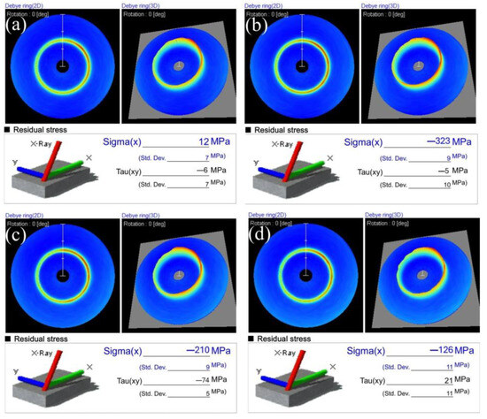 The Debye–Scherrer rings and residual stress for the raw strip and the STACERs stabilized under different heat treatment conditns: (a) raw strip; (b) 290 °C + 2 h; (c) 320 °C + 2 h; and (d) 350 °C + 2 h.