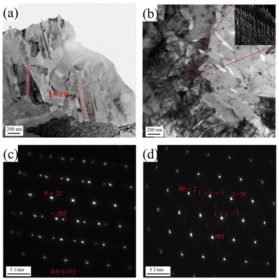 Results of the TEM measurements. Raw strips (a); STACER (320 °C + 2 h) (b); SAED for twins and diffraction spots of the substrate at the crystal axis of [111] (c); and SEAD for the streak-shaped patterns (d) of the QBe2.0 alloy strips.