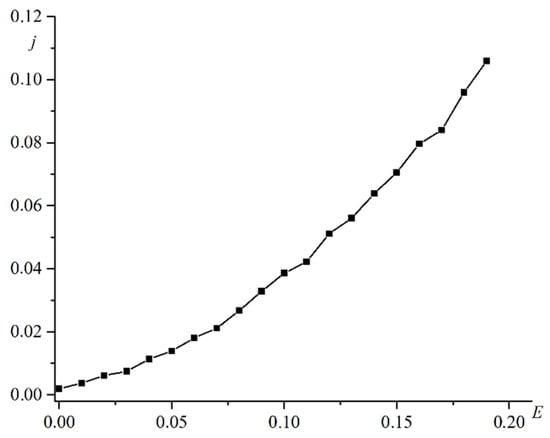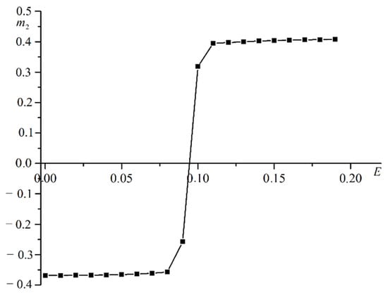 The electric field creates electron motion in the positive direction of the OZ axis in a computer simulation. Electrons transfer spin from a magnetically hard film to a magnetically soft film. The spins of the magnetically hard film are oriented in the positive direction of the OZ axis in the absence of an electric field. Magnetization in this film has a positive value. The spins in the second film are oriented in the negative direction of the OZ axis in the absence of an electric field. The magnetization in the second film is negative. This magnetization orientation is maintained at temperatures below the Curie point in the absence of electrical current. The electric current passes from the nonmagnetic film to the magnetically hard film and is polarized. Spin-up electrons interact with the spins of atoms in a magnetically soft film. If there are many polarized electrons, then there is a magnetization reversal in the magnetically soft film. A computer experiment studies the dependence of magnetization in a magnetically soft film on the strength of an electric field. Figure 2 shows a plot of this relationship.