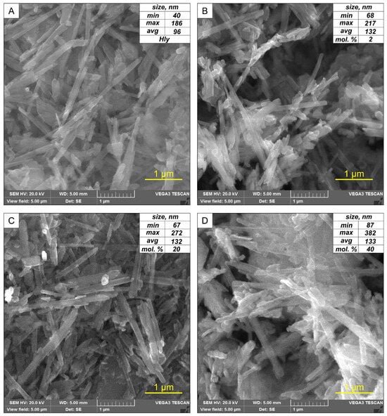 The initial halloysite concentrate is a concentration of chaotically oriented nanotubes with a length of less than 5 μm and an average diameter of about 96 nm. Morphometric analysis of SEM images was performed to analyze in more detail the morphological changes of the nanotubes after activation. For each nanocomposite, observations were made in 10 sections. The initial width of the tubes averaged between 79 and 114 nm (representing the first and third quartiles). After chemical activation, the increase in the average crystal diameter reaches 127–132 nm (Supplementary Materials, Table S1). The maximum diameter values are observed in the Hly-7Å-Zn40 nanocomposite and reach 382 nm (Figure 1C). These results confirm the morphological changes of the nanotubes after chemical activation.