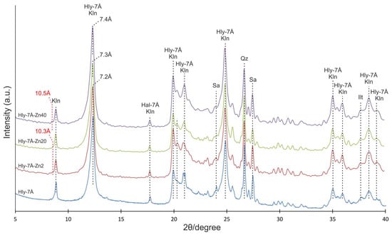 XRD patterns of the initial halloysite concentrate (Hly-7Å) and activated nanocomposites (Hly-7Å-Zn2, Hly-7Å-Zn20, Hly-7Å-Zn40). Hly-7Å—halloysite; Kln—kaolinite; Sa—sanidine; Qz—quartz. The red dotted lines are the new basal peaks (10.3 Å and 10.5 Å).