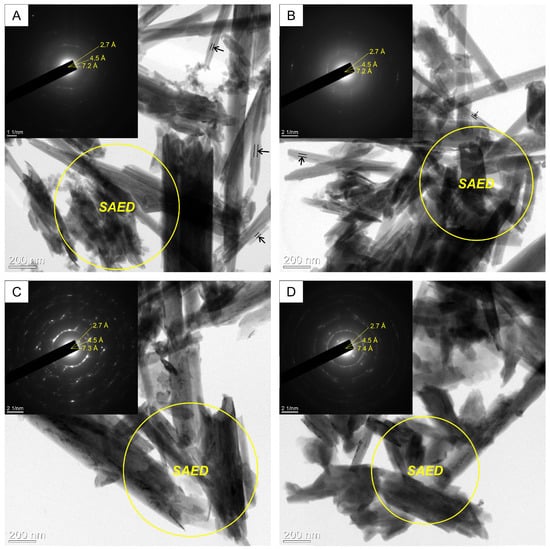 The peculiarity of the chemical activation in this work is using zinc sulfate as a solution. According to XRD data in the activated composites, as the concentration of zinc sulfate in the reagent solution increases, a shift of the first basal reflex by about 0.2 Å in the direction of the crystal lattice expansion is observed (Figure 2), which shows the adsorption of zinc in the micropores of the mineral. The expansion of the crystal lattice of halloysite after the activation experiments is also confirmed in TEM images from local electron diffraction patterns (Figure 3). Besides the increase in the interlayer spacing, new basal peaks at 10.3 and 10.5 Å are observed, indicating an increase in the thickness of the 10 Å interlayer spacing of halloysite, which overlapped with the first basal peak of kaolinite (9.95 Å). The last is also confirmed by the increasing intensity of the new basal reflex as the zinc solution concentration increases. At first glance, the interplanar distance increased insignificantly, but according to the morphometry of halloysite nanotubes on SEM images, their width increases by an average of 33 nm as the concentration of the initial reacting solution increases. The linear increase in the average width of the nanotubes shows the expansion of the interlayer distance of the halloysite due to the introduction of the zinc substance into the meso-micro pores (Supplementary Materials, Table S1). Another crucial aspect is that the SEM image (Figure 3A) shows that most of the nanotubes in the original halloysite have a transparent central part. Conversely, this is not the case for the activated composites; the central part of the nanotubes is not transparent (Figure 3B–D). This implies that aside from the interlayer space, the zinc substance also occupies the central part.