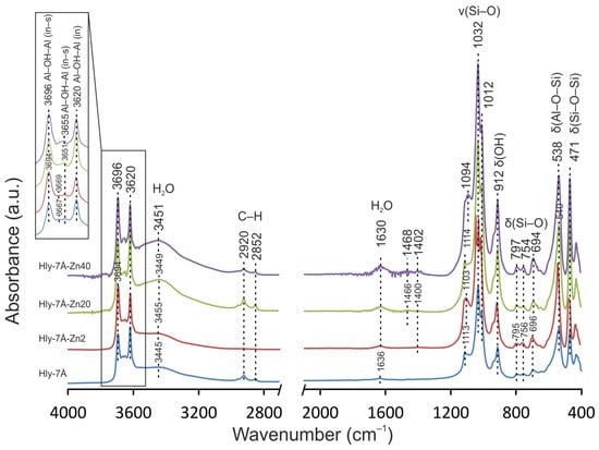 The infrared spectra of the obtained composites are characterized by strain fluctuations in the range of 3694–3696, 3667–3669, 3651 and 3665 cm−1, corresponding to the characteristic groups of the inner surface and inner Al–OH–Al (Figure 4). It is important to note that the strain fluctuations associated with the inner surface OH ions become less pronounced starting from the Hly-7Å-Zn20 composite. It is also observed that the peaks at 3445, 3449, 3451, 3455, 1636, 1630, and 1400–1468 cm−1 represent adsorbed water, and an increase in the intensity of the stretching vibrations is observed with increasing solution concentration. At the same time, the absorption bands in the C–H group of the alkylammonium, which are in the range of 3000–2800 cm−1, remain almost constant in intensity, as do the symmetric and asymmetric vibrations in the low-frequency range.