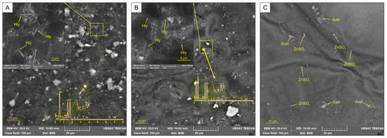 The design of the authors’ work was focused on creating composites of targeted action with the possibility of using them by spraying them on plants, i.e., in the agroindustry. The presence of sharp or fractured edges on halloysite nanotubes facilitates a robust adhesion to plant tissues, enabling a targeted administration of micronutrients (such as zinc) through a “poking” or “injection” mechanism. This feature prevents the undesired removal of these nutrients by rain or irrigation water. The images from the SEM obtained of the plant tissue surface treated with nanocomposite fertilizer demonstrate the observable impact of nanotubular halloysite particles, as shown in (Figure 6A). After washing experiments with rain-simulating water, most of the nanotubes remained attached to the plant tissue surface (Figure 6B). Conversely, the sprayed zinc sulfate was almost entirely removed from the leaf surface (Figure 6C). It was observed that premoistening the leaf surface did not stop the halloysite nanotubes from sticking to it.