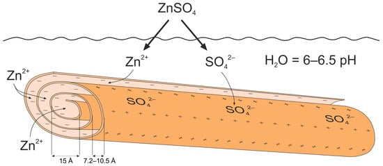 According to SEM-EDS data, the amount of zinc adsorbed on the nanotube surface in activated nanocomposites with 2% and 20% zinc sulfate solutions did not stay the same. At the same time, there were intense zinc signals on the spectrum. However, the interlayer distance in the Hly-7Å-Zn20 nanocomposite increased to 7.3 Å, indicating the incorporation of zinc into the mineral structure. The inner and outer walls of halloysite nanotubes exhibit pH-dependent positive and negative charges [34,37]. In acidic environments, the nanotubes’ outer surface develops positive charges due to deprotonation [37]. Conversely, the inner surface acquires positive charges from outer wall protonation in alkaline environments. It should be noted that under highly acidic or alkaline conditions the nanotube structures degrade [64]. The solution was prepared by dissolving zinc sulfate in distilled water with an approximate neutral pH of 5.0–7.0. Under these circumstances, correspondingly, Zn+ cations and SO42- anions from dissolved zinc sulfate will be drawn to the opposing charges of the inner and outer surfaces of the nanotubes (Figure 7). Under this environment, the surface of halloysite nanotubes has a neutral or slightly positive charge (Figure 7) [64]. On the other hand, plant cell membranes are negatively charged, which, according to the laws of electrostatic interactions, favors the penetration into plant tissues and the slow release of positively charged Zn+ ions [65]. The presence of a modest positive charge on the surface of the nanotubes may have prevented random adsorption onto the surface. This may explain why the nanotubes took up the whole Hly-7-Zn20 nanocomposite solution, including the large, medium, and small pores. At a 40 mol% zinc sulfate concentration, the Hly-7-Zn40 nanocomposite had 1.4 wt% of zinc on the surface of the nano-needle particles. Also, no independent zinc compounds were observed upon detailed examination of the activated nanotubes via SEM.