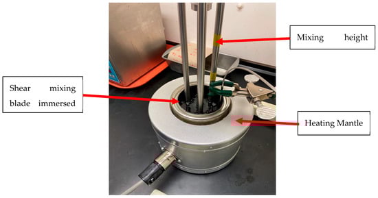 The blending of the modified binders was completed using a high-shear mixer, as shown in Figure 2. The base (virgin) asphalt binder was preheated to a temperature of 163 °C and transferred to a heating mantle. The binder was sheared at a low speed of 510.5 RPM using the high shear mixer to ensure that any entrapped air was removed and enable the sample to reach the blending temperature range (160–170 °C). The temperature was maintained and monitored within this range for up to 10 min to ensure that the blending of recycled plastic pellets was performed within the appropriate temperature range. The sample was then sheared at a high speed of 3014 RPM, and the recycled plastic pellets were added slowly. The blending process continued for at least one hour or until a homogeneous mixture was developed. The above procedure was developed according to previous trials to ensure a complete dispersion of the recycled plastic pellets within the base binder.