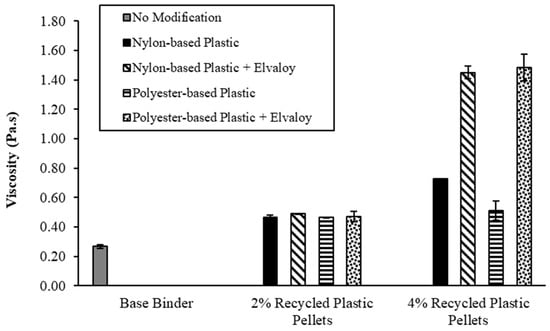 For binders modified with 4% recycled plastic pellets, the increase in viscosity of the modified binders ranged from 90.3% to 170.9%. The viscosity of binders modified with polyester-based plastic increased by 17.2% only due to increasing plastic content from 2% to 4%. However, the viscosity increased by 96.5% for binders modified by nylon-based plastic due to increasing plastic content by 2% to 4%. The addition of Elvaloy copolymer resulted in a significant increase in the viscosity of the modified binders, where the increase in viscosity ranged from 441% to 453.2%.