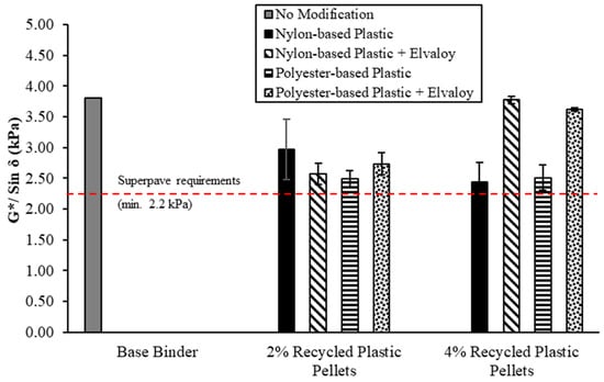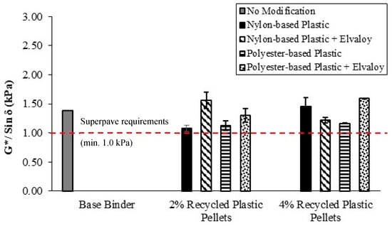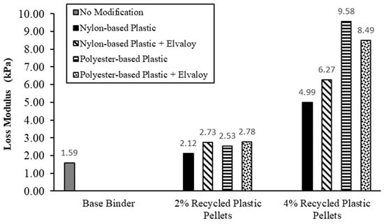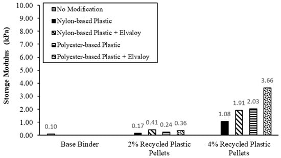 - The elastic behavior of the modified binders improved at 58 °C. The storage modulus for binders modified with nylon-based plastic pellets increased by 62.5% for a 2% dosage and by 952.4% for a 4% dosage. The storage modulus for binders modified with polyester-based plastic pellets increased by 133.0% for a 2% dosage and by 1875.6% for a 4% dosage. The addition of Elvaloy copolymer resulted in a further improvement in the elastic response of the modified binders.