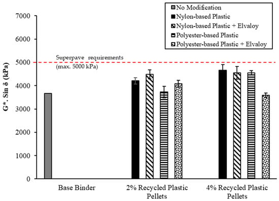 PAV-aged binders were tested to evaluate their fatigue performance according to the Superpave specifications. The DSR test temperatures were selected based on the maximum PG temperatures listed in Table 6 and a minimum PG temperature of −28 °C for all modified binders. Figure 8 shows the DSR results for PAV-aged binders. All modified binders have met the Superpave fatigue cracking requirements, as shown in Figure 8, at their test temperatures.