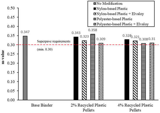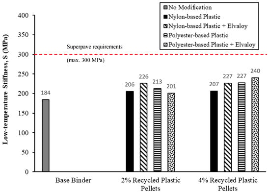 - The addition of both types of plastic pellets did not have a significant impact on the low-temperature behavior of the modified binders. All modified binders met the Superpave requirements for low-temperature cracking at the BBR test temperature (−18 °C).