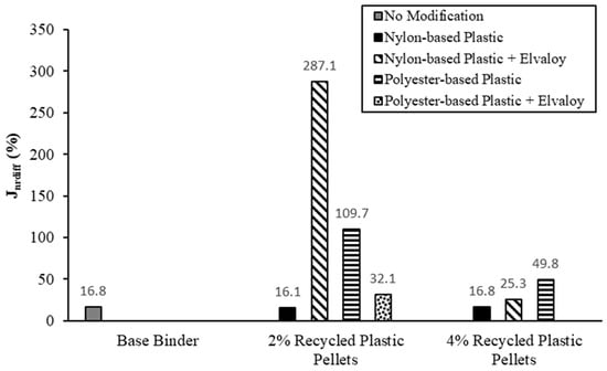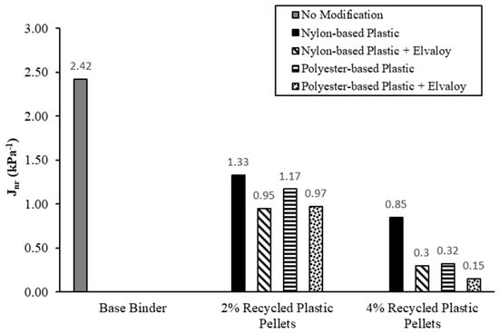 Figure 11 shows the values of Jnr for the tested binders at a temperature of 58 °C. For a 2% dosage of recycled plastic pellets, Jnr for the modified binders decreased by 45.0% to 60.7% for both nylon-based and polyester-based pellets. Increasing the dosage of the recycled plastic pellets to 4% resulted in a stiffer response of the modified binders, where Jnr decreased by 64.9% to 93.8%. For the same dosage and type of recycled plastic pellets, the addition of Elvaloy copolymer resulted in a further decrease in Jnr values.