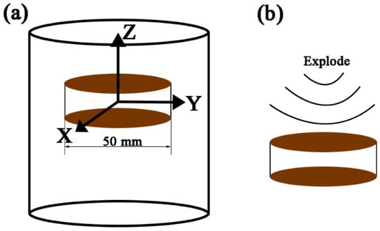 The material used in this experiment was cut from a forged TB6 bar (Ti-10V-2Fe-3Al), and the specimens for planar wave detonation were cut from TB6 bar with the dimension of Φ50 mm × 5 mm, as shown in Figure 1. The specimens were stacked one by one and loaded by detonation, which was deformed in different degrees from near to far from the explosion center, in addition, from center to edge of the specimen, the strain rate is about 105–106 s−1. In this work, low, middle, and high deformation specimens were selected to investigate the twinning characteristics under various deformations, which are denoted by LD, MD, and HD (with deformation strain about 10%, 40%, and 60%), respectively. The samples with a dimension of 8 mm × 5 mm × 5 mm (along with X × Y × Z) were cut from different deformation locations of specimens. The X-Z plane paralleling to the forging axis (Z) was used to show the microstructure evolution after deformation along the Z axis (loading direction), and the IPF-Z image was used to reveal the texture because it is perpendicular to the loading direction. The surface was mechanically ground and then electrochemical polishing was conducted to remove the surface stress with the voltage and current of 27.8 V and about 300 mA, respectively. Finally, the sample was etched by the Kroll agent to reveal the microstructure.