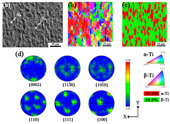 Figure 2 shows the initial microstructure and orientation of raw materials. From Figure 2a, it is found that TB6 is composed of lamellar primary α(αp), acicular secondary α(αs), and β matrix, αs are separated because TB6 raw bar was forged in the two-phase area and αs formed during cooling of the forged alloy. Although αs can be observed in SEM images, it could not be observed in EBSD with the scanning step of 0.2 μm, such as in Figure 2b,c, since the grain size of αs is very fine. In Figure 2b,c, the black and white lines represent the grain boundaries and phase boundaries, respectively. In addition, the red and green colors in the phase mapping Figure 2c correspond to α and β phase, respectively. Compared with Figure 2b,c, the orientation of α and β is mainly //X-Y plane in α phase, while and //X-Y plane in β phase, respectively. The volume fraction of α and β is 31.4% and 68.6%, respectively. Figure 2d shows the pole figures of α and β of , , and and , , and respectively. The texture type of α is and β is mainly and texture with a maximum intensity of 12.68. It should be noted that the texture intensity of α is lower than β, corresponding to the results of Figure 2d, two of which follow the Burgers orientation relationship with , .