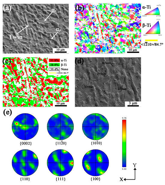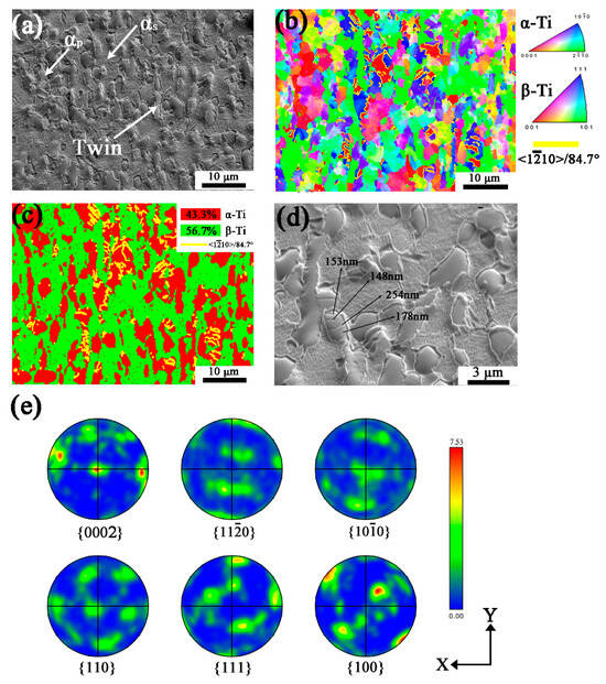The microstructure and orientation of the MD specimen are shown in Figure 4. Twins are also found in the SEM image of Figure 4a. In Figure 4b,c, α is mostly and //X-Y with few based on the orientation colors, while β is mostly //X-Y plane. As for the MD specimen, the misorientation of twinned grains is about 15°, greater than the LD specimen, representing more intense deformation of α grains. The phase fraction of α and β is 42.5% and 57.5%, respectively, according to the phase mapping in Figure 4c. Twins are mostly generated in grains with few existing in grains, the orientation of which is //X-Y plane, and the twin boundaries of are shown in yellow lines in Figure 4b–c. Figure 4d shows the high-magnification SEM image of MD specimen, the twins are parallel to each other and more than LD specimen, whose width is from 150 nm to 300 nm. As represented in Figure 4e, the texture of α is and weak , in the meantime, β is mostly //X-Y plane. It shows the orientation of α changes from to with larger deformation.