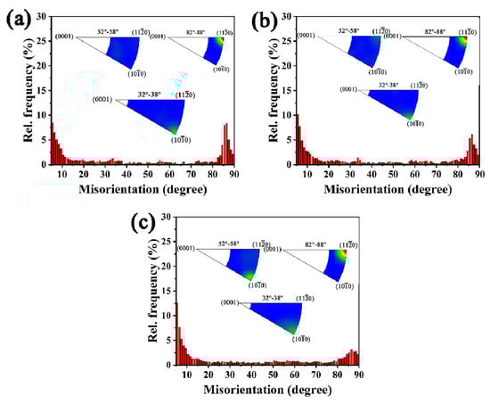 To investigate the twin type operated during deformation, the misorientation angle distribution of the α phase after the planar wave detonation is shown in Figure 6. It is revealed that the misorientation angle is concentrated at both the angles less than 10° and the angles more than 80°, and the former is due to low-angle boundaries formed in deformation, while the latter is due to the twinning process. In addition, when the deformation strain increases from LD to HD, the relative frequency of the misorientation angles less than 10° increases, while that more than 80° decreases gradually, but the distribution peaks become broader. The peak misorientation angle/axis between 82° and 88° is concentrated in axis, which is belonging to twin mentioned in Figure 3b, Figure 4b and Figure 5b. Moreover, the peak misorientation angle/axis between 32° and 38° is concentrated in axis as shown in the inner Figure in Figure 6a–c, which may belong to twins. The misorientation angle/axis between 52° and 58° is only discovered in the HD specimen with the misorientation axis around directions. Since the high angle boundaries other than the angles around 84.7° exhibit a low area fraction, then twin is discussed in detail.