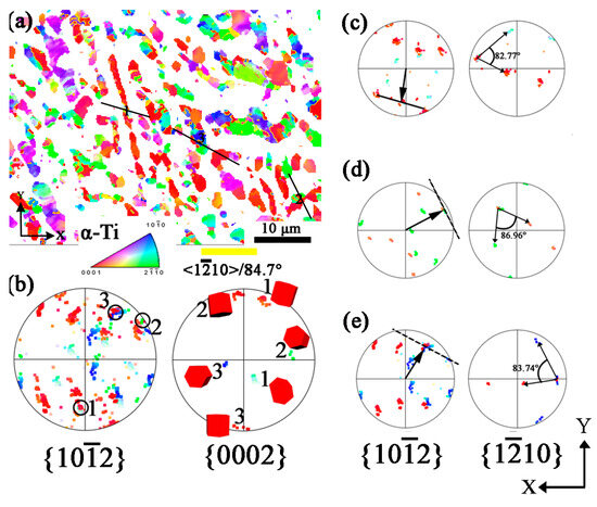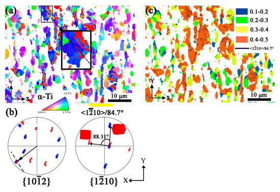 Figure 7a shows the orientation mapping of only α phase and twins inside it, and the yellow line represents twin boundaries. It shows only //X-Y plane twin (in red color) produced in grain. The and pole figures for the area marked by a black rectangle are shown in Figure 7b. Apart from the misorientation mentioned before, the pole figures directly show the twin relationship, i.e., one of the or poles coincide with each other, respectively. Moreover, the trace of the twin boundary (black line) is normal to the coincidence poles, and it further supports the proposed twin type. The misorientation angles around 84.7° are found in Figure 6, and the scattering distribution is due to the deformation of α phase. The variation of the orientations can be also found in the pole figures in Figure 7b, for example, the rotation angle of twin around for 88.31° is schematically shown.