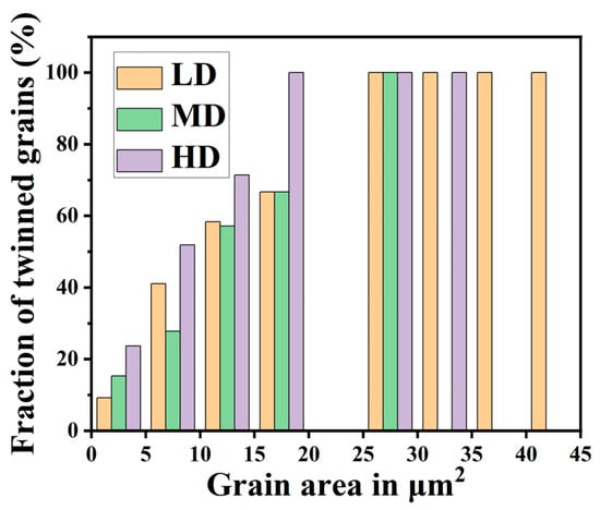 Fraction of twinned grains (=number of twinned α grains/total number of α grains in the size range) in different deformation specimens. (Yellow column represents LD specimen, green column represents MD specimen, purple column represents HD specimen).