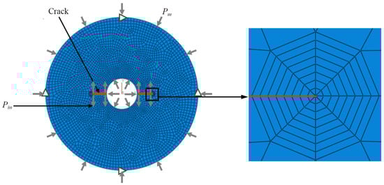The meshing and boundary conditions of the HDWS specimen model are shown in Figure 2. The global node size of the model was set to 1 mm. The free division method was used to mesh the specimen except the crack tip using four-node, bilinear, plane stress quadrilateral elements (CPS4). Due to the singularity in the stress field at the crack tip, the first ring of elements around a crack tip was set as quarter-node singular elements, and the rest of the crack tip was meshed into eight rings of quadrilateral elements using the sweeping technique. The horizontal displacements at the top and bottom end nodes of the model were constrained, and the vertical displacements at the left and right end nodes of the model were also constrained. The load applied to the model consists of two parts: an external confining pressure (Pm) to simulate in situ stress and a water injection pressure (Pin) to simulate hydraulic fracturing at the hole and crack surfaces. The absolute magnitudes of these two loads do not affect f []. Therefore, Pm and Pin were set to 100 MPa each for the subsequent calculation of f under these two different load cases.
