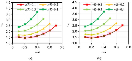 Calculation results of f for the HDWS specimen of isotropic material with different a/R values under Pin or Pm loading. (a) f under Pin loading. (b) f under Pm loading.