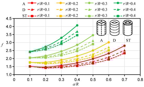 To study the influence of the bedding angle on f for the HDWS specimen of transversely isotropic material, the corresponding f was calculated with a Young’s modulus ratio ξ of 2 and a shear modulus ratio ƞ of 1 for three bedding orientations, i.e., A, D, and ST orientations. As shown in Figure 4, when the crack is long and all other conditions are the same, f is the largest in the specimen with an A direction and the smallest in the specimen with an ST direction. The crack length a has a significant impact on the difference in f between specimens with different bedding orientations. When the crack length is short, the difference in f between specimens with different bedding orientations is small (almost the same at a/R = 0.1). However, as the crack length increases, the difference in f between specimens with different bedding orientations gradually increases. Similar findings have also been reported in studies of f for other transversely isotropic specimen configurations by other researchers. Nejati et al. [] examined the SIFs of semicircular fracture specimens with different bedding orientations (A, D, and ST). Their calculation results showed that the f, or YI, of the semicircular fracture specimen was significantly affected by the bedding orientation. There was a notable difference in the fs among the specimens with the three bedding orientations; YI was the largest for the specimen with an A orientation and the smallest for the specimen with an ST orientation, and the difference in YI among the specimens with the three bedding orientations increased significantly with increasing crack length.