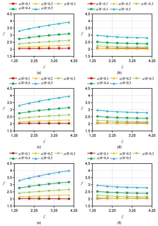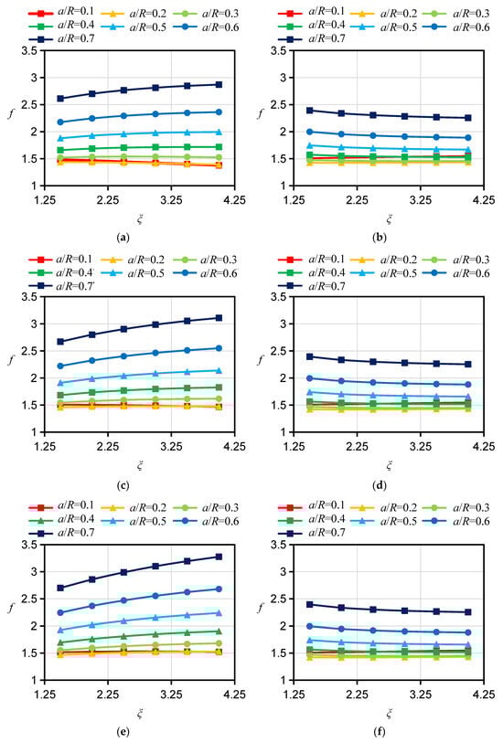 Results of f for specimens with r/R = 0.3 and different material anisotropies. (a) A orientation ƞ = 0.7. (b) ST orientation ƞ = 0.7. (c) A orientation ƞ = 1.0. (d) ST orientation ƞ = 1.0. (e) A orientation ƞ = 1.3. (f) ST orientation ƞ = 1.3.