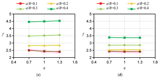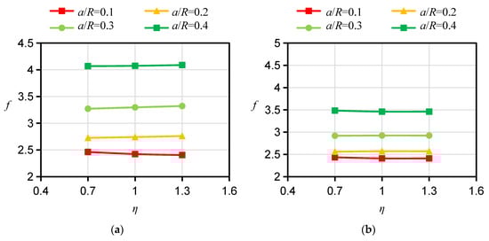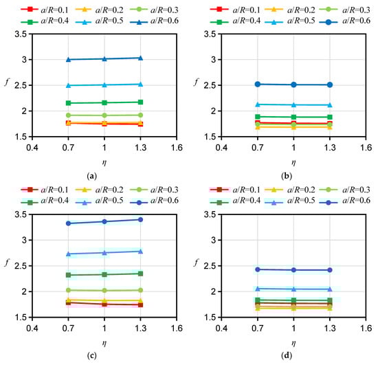 For the specimen with a D orientation, both the bedding planes and their normals are perpendicular to the crack plane. In the 2D case, the calculation of f can be simplified to an isotropic problem and is not affected by the Young’s modulus ratio ξ or the apparent shear modulus ratio ƞ. For this reason, the influence of ξ and ƞ on f for the specimen with a D orientation is no longer considered in the calculation. However, there is a pronounced difference between the influences of ξ and ƞ on fs for specimens with A and ST orientations, respectively. Therefore, the fs for HDWS specimens with A and ST orientations were investigated considering different values of the Young’s modulus ratio ξ and apparent shear modulus ratio ƞ. The f values corresponding to ξ values of 1.5, 2, 2.5, 3, 3.5, and 4 and ƞ values of 0.7, 1.0, and 1.3 were calculated using ABAQUS 2021 software, and the results are shown in Figure 5, Figure 6, Figure 7 and Figure 8.