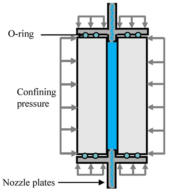 The hydraulic fracturing experiments on the HDWS specimens of the Longmaxi shale with three different bedding orientations (A, D, and ST) were carried out using the multiphysics coupling triaxial testing system (Top Industrie, France) at Sichuan University. The triaxial chamber of the apparatus can measure specimens with a standard radius of 50 mm or 25 mm and has a maximum axial load of 2000 kN, a maximum confining pressure of 100 MPa, linear variable differential transformers (LVDTs) with a range of 100 mm for measuring the machine displacement, LVDTs with a range of ±50 mm and ±10 mm for measuring the longitudinal deformation of the specimen, a maximum liquid osmotic pressure of 100 MPa, and a maximum gas osmotic pressure of 100 MPa. The HDWS specimen loading mode is shown in Figure 9. This loading mode can simulate the in situ stress and water injection pressure in hydraulic fracturing. This experiment was conducted only to verify the f obtained from the numerical simulation, so it was performed under a confining pressure of 0 MPa. The specimen was connected to the sealing heads at the top and bottom, with O-rings installed inside the sealing heads to effectively prevent the leakage of water and the pressure within the hole after the application of axial pressure. In the experiment, the axial pressure was applied at a rate of 0.2 MPa/s to a target stress of 5 MPa, and then the stress state was held constant for 2 min. After the specimen was fixed, distilled water was injected as a fracturing fluid into the specimen from its bottom at a constant rate of 4 mL/min using a servo-controlled injection system. After the specimen was fractured, the fracturing fluid continued to be injected for a period to stabilize the pressure inside the triaxial chamber, thus bringing the entire experimental system to an equilibrium state.