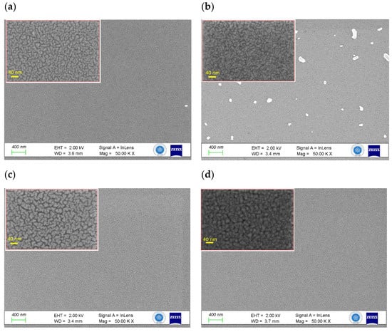The surface morphology of the MoO3 film was meticulously examined through the utilization of FESEM in both its un-annealed and post-annealed states. Figure 1 captures the essence of this analysis by showcasing the distinct surface characteristics of two specific configurations: Mo/2 nm Ir/SiO2/Si and Mo/4 nm Ir/SiO2/Si thin films. The surface morphologies of the un-annealed Mo/2 nm Ir/SiO2/Si and Mo/4 nm Ir/SiO2/Si thin films are shown in Figure 1a,c, respectively, while those of the post-annealed Mo/2 nm Ir/SiO2/Si and Mo/4 nm Ir/SiO2/Si thin films are shown in Figure 1b,d, respectively. Upon delving into these images at varying magnifications, a consistent observation emerges. Both sets of samples exhibit a profusion of closely packed particles that extend across a substantial area. This feature is maintained at both low and high magnifications. Moreover, a remarkable homogeneity is evident in the films, characterized by the presence of small grains that are uniformly dispersed. However, it is crucial to acknowledge the emergence of white larger particles in these images. These larger particles are a consequence of the sample preparation process, particularly the cutting procedure that precedes the FESEM analysis. This underscores the necessity of distinguishing between the genuine surface features and the artifacts introduced during the analytical stages. Upon a comprehensive assessment, a significant insight arises. The thin films subjected to the annealing process display a denser composition in contrast to their non-annealed counterparts. Additionally, there is a discernible trend concerning the thickness of the Ir layer. An increase in Ir thickness corresponds to an augmentation in both the size and density of the surface particles, as visibly exemplified in the images.