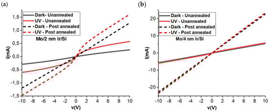 One intriguing observation is that the annealing treatment leads to an augmentation in both the dark current (the current flowing through the film in the absence of any external illumination) and the photocurrent (the current generated when the film is exposed to light) for both the samples with 2 nm and 4 nm thick Ir layers. Furthermore, a distinctive differentiation emerges when comparing the two samples. The film of Mo/4 nm Ir/SiO2/Si exhibits what is termed ohmic behavior under dark conditions. This essentially means that the electrical behavior of this film demonstrates a linear relationship between the voltage and the current, indicating a straightforward conduction mechanism. On the other hand, the situation is notably different for the film where the Ir layer is a mere 2 nm thick. This film showcases what is known as Schottky behavior when subjected to UV illumination. This type of behavior implies a more complex conduction mechanism influenced by the interaction between the metal and the semiconductor.