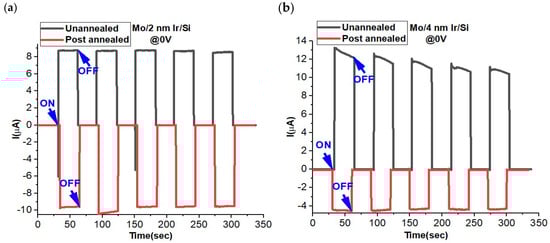 The performance of photodetectors and optoelectronic devices is depicted through their ON–OFF curve. This curve illustrates their response over time when exposed to light (ON) or when the light source is turned off (OFF state) under a specific bias voltage. It is crucial to repeat this process multiple times to grasp the devices’ overall behavior over time. Applying a bias voltage is known to enhance photocarrier generation and, subsequently, photodetection capacity. However, there is a growing interest in self-powered optoelectronic devices, like zero-voltage operating devices. These can be activated under specific conditions, as seen in p–n junction photodetectors [,,], Schottky junction photodetectors [,,], and photoelectrochemical-type (PEC-type) photodetectors [,,]. Figure 4 illustrates the ON–OFF photoresponse for both un-annealed and post-annealed conditions. In the case of the non-post-annealed MoO3 layer on Ir/SiO2/Si, the MoO3 is deposited via ALD at 200 °C []. In contrast, samples subjected to annealing treatments undergo a rapid annealing process at 600 °C in air, as optimized earlier []. Under un-annealed conditions, the Mo/4 nm Ir/SiO2/Si sample exhibits a higher ON–OFF ratio than that of the Mo/2 nm Ir/SiO2/Si sample. This observation aligns with the anticipated behavior based on IV electrical curves, suggesting greater conductivity in the Mo/4 nm Ir/Si sample. Notably, the ON–OFF results reveal a minor decay in the ON state for Mo/4 nm Ir/SiO2/Si, which is absent in the Mo/2 nm Ir/SiO2/Si case, indicating higher dynamic stability in the latter. These findings suggest positive photoconductivity in the un-annealed samples, along with low dark current in both the un-annealed and post-annealed scenarios. Conversely, the samples subjected to annealing exhibit negative photoconductivity behavior at a 0 V bias voltage. The ON–OFF ratio is higher for the Mo/2 nm Ir/SiO2/Si sample compared to that of the Mo/4 nm Ir/SiO2/Si. Both samples demonstrate consistent signal dynamics over time.