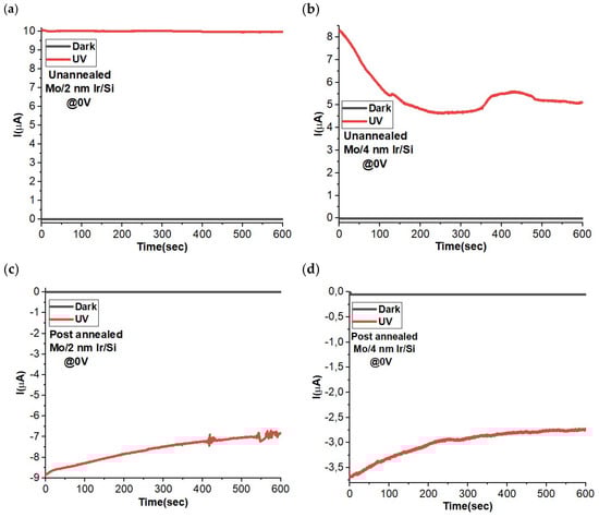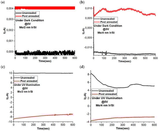 Current–time transient behavior under dark and UV illumination of Mo/2 nm Ir/SiO2/Si (a,c) and Mo/4 nm Ir/SiO2/Si (b,d) for un-annealing and annealing treatment. The measurements were collected at 0 V bias voltage for self-power photodetector measurements.