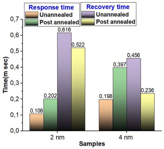 The assessment of the response and recovery times, with a particular focus on the influence of annealing processes, holds pivotal significance in the comprehension of the overall performance characteristics of the self-powered photodetector. The corresponding results are graphically presented in Figure 7. In a general context, it is evident that the response time exhibits a shorter duration for the 2 nm Ir thick sample as compared to its 4 nm Ir counterpart, under both the un-annealed and post-annealed conditions. This swifter response time can be attributed to the enhanced carrier mobility properties inherent to the 2 nm Ir samples, which are inherently linked to the electrical characteristics of these specimens. Conversely, when examining the recovery time, a slight delay is observed for the 2 nm Ir sample in comparison to the 4 nm Ir sample. Nevertheless, it is worth noting that both sample categories demonstrate remarkably rapid response and recovery times, typically falling within the range of 0.1 to 0.6 milliseconds. Furthermore, the 2 nm Ir sample distinguishes itself by showcasing the shortest response time of just 0.1 milliseconds. These findings underscore the critical role played by both the annealing processes and the thickness of the Ir layer in shaping the response and recovery dynamics of the self-powered photodetector and thereby offer valuable insights into its operational capabilities and potential applications.