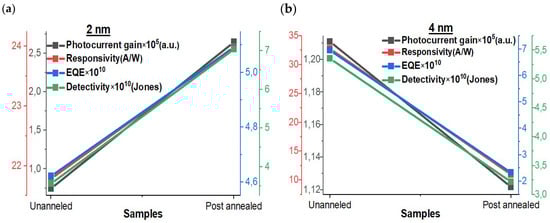In addition to scrutinizing the response and recovery times, it is imperative to delve into several other critical parameters that serve as essential benchmarks for evaluating the overall performance of the photodetector. Specifically, we turn our attention to photocurrent gain, responsivity, EQE, and detectivity, which are assessed under both un-annealed and post-annealed conditions for Mo/2 nm Ir/SiO2/Si and Mo/4 nm Ir/SiO2/Si configurations, as represented graphically in Figure 8. It is worth noting that these parameters have been extensively explored and discussed in numerous research articles [,]. As anticipated, the 2 nm thick Ir sample demonstrates superior performance characteristics following the annealing treatment. In this regard, the sample transforms into exceedingly thin plasmonic films characterized by elevated carrier concentrations and accelerated charge mobility. This transformation leads to notable enhancements across various photodetector parameters. For instance, the detectivity metric exhibits marked improvements under annealing treatment, reflecting the heightened sensitivity and detection capabilities of the photodetector. Conversely, the inverse scenario unfolds for the 4 nm thick Ir samples; thus, it is in alignment with the previously observed trends in optoelectronic measurements. Annealing treatment adversely affects the photodetector’s performance, resulting in diminished photodetection capabilities. These findings collectively underscore the pivotal role played by annealing processes and the thickness of the Ir layer in influencing the photodetector’s key performance parameters and thereby provide valuable insights into its operational efficacy and potential applications.