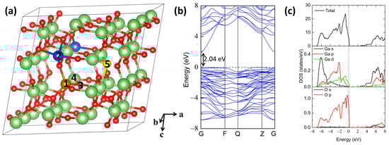 To study the structural stability of Fe-doped β-Ga2O3 supercells, the defect formation energies under different conditions are calculated, as shown in Figure 2. Meanwhile, the transition levels are also employed to assess the ionization energies and the effectiveness of the doped systems. Our calculated value of the band gap for perfect β-Ga2O3 is 2.04 eV, as denoted by the dashed line in Figure 1b, which is consistent with the values obtained by the DFT calculated method but smaller than the experimental values [44]. The underestimated band gap for DFT calculation is a common phenomenon; however, it does not affect our conclusions qualitatively [45,46]. In addition, Figure 1c illustrates the calculated total density of states (TDOS) and partial density of states (PDOS) for perfect β-Ga2O3; the VBM is predominantly composed of O 2p orbital-derived states with minor hybridization with Ga 3d and 4p orbitals, while the CBM is mainly formed by Ga 4s orbitals.