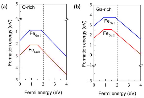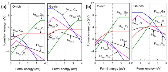 Figure 2a indicates the formation energies for Fe-doped β-Ga2O3 under O-rich conditions. FeGaΠ case has lower formation energy, suggesting the preferential occupation of FeGa at the octahedrally coordinated Ga site, which is in agreement with Ingebrigtsen’s conclusion by theoretical calculation [25] and other experimental results [19,20]. The thermodynamic transition level Fe3+/Fe2+ for FeGaΠ, i.e., ε(0/−), is located at 0.52 eV below CBM, which is comparable to the theoretical value calculated by HSE hybrid functions (0.61 eV or 0.40 eV [25]), but slightly smaller than the reported experimental values (0.78 eV [25], 0.80 eV [26], 0.84 eV [17], 1.2 eV [22]). The transition level Fe3+/Fe2+ for FeGaI measured from VBM is 0.24 eV below CBM, thus deep acceptors are expected for both Fe-doped β-Ga2O3 configurations in the n-type β-Ga2O3 conditions, which can compensate for the free electrons caused by native defects or extrinsic impurities. In addition, the transition level ε(+/0) for both FeGaI and FeGaΠ is 0.86 eV above the VBM, which demonstrates that both doping cases generate deep donors even in the p-type β-Ga2O3 crystals. For the Ga-rich condition, i.e., the O-poor condition, as shown in Figure 2b, the tendency is the same as for the O-rich atmosphere, with the exception of higher formation energies. This suggests that Fe impurity is more easily substituted for Ga sites under O-rich conditions.
