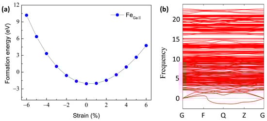 (a) The formation energies of FeGaΠ as a function of the biaxial strain with q = 0 under O-rich conditions. (b) The phonon dispersion calculations for the FeGaΠ doping configuration.
