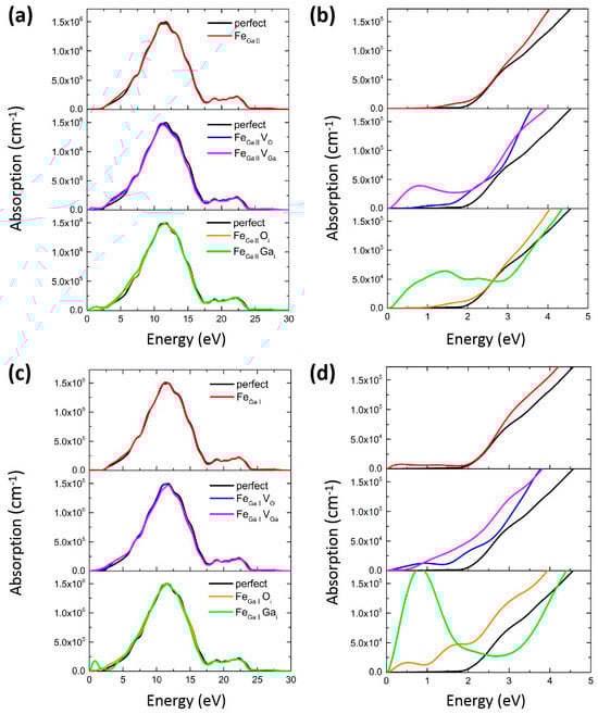 For wide-band gap semiconductor materials, optical parameters of dielectric function can be employed to clarify the linear response of the system to electromagnetic radiation, which is crucial to assessing the interactions between photons and electrons. The imaginary part of the dielectric constant is related to the absorption of light and the dielectric energy-loss function, while is associated with the stored energy. Figure 5 denotes the optical absorption coefficient of perfect, Fe-doped, and various FeGaΠ/FeGaI complexes in the energy range between 0 and 30 eV. Figure 5b,d exhibits the enlarged plots at the (0–5) eV region. The strong absorption peaks are located at 11.8 and 10.9 eV for perfect β-Ga2O3, as shown in Figure 5a, which originate from the inter-band transitions from O 2p states to Ga 4s states, illustrating that the bulk material is characterized by its deep ultraviolet properties. The calculated data is consistent with Yan and Pan’s results [52,53]. Compared with perfect β-Ga2O3, the profiles of Fe-doped β-Ga2O3 and various complexes in Figure 5a,c are endowed with similar absorption peaks in the high-energy ultraviolet region, indicating that these dopants can hardly decrease the optical absorption coefficients of β-Ga2O3 in the deep ultraviolet region. The slightly red shift for FeGaΠVGa, FeGaIVGa, FeGaΠOi, and FeGaIOi can be ascribed to hole doping, while the blue shift for the FeGaΠGai, FeGaIGai cases can be associated with the introduction of electrons, which is consistent with our formation energy calculations above. In addition, one can obviously notice that new peaks appear in the low-energy region for these FeGaΠ/FeGaI complexes, as shown in the amplified plots shown in Figure 5b,d.