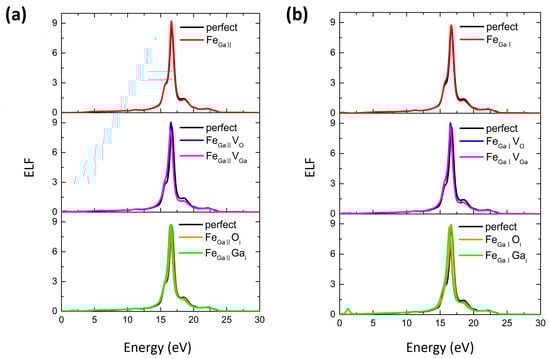 The energy-loss function (ELF) is calculated based on Equation (9) from the dynamic dielectric constant at small scattering angles, which can determine the energy loss of free electrons across the material. This ELF function allows a direct comparison between theoretical conclusions and experimental spectroscopy measurements such as EELS [54]. Figure 6 shows the ELF spectra for FeGaΠ and FeGaI complexes. The major peak for perfect β-Ga2O3 is located at 16.7 eV. The peak positions remain at the same locations for FeGaΠ and FeGaI, while accompanying with higher ELF value. This indicates that the induced Fe dopant tends to increase its energy loss and decreases its emission of peak energy efficiency under the high energy region in the material. The changes in the primary peaks for these FeGaΠ and FeGaI complexes are also minor, showing that the energy loss in the β-Ga2O3 material is almost negligible after the extra introduction of various native defects. Additionally, a seemingly little peak develops in the low-energy region for the FeGaIGai case, which may be attributed to the optical absorption peak of ~0.84 eV in Figure 5d.