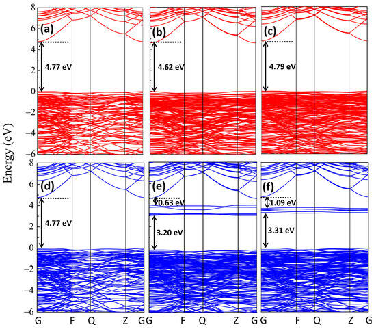 The GGA + U calculated spin-up and spin-down band structures of the perfect β-Ga2O3 configuration are shown in Figure 7a,d. The perfect β-Ga2O3 is endowed with a band gap of 4.77 eV accompanied by a direct semiconductor structure, which is in good agreement with the experimental band-gap value of 4.78 eV [55]. The much flat valence bands illustrate a large effective mass and low mobility, which prevent the formation of p-type β-Ga2O3. The main orbital compositions of the VBM and CBM are consistent with those from GGA calculations, as mentioned before. Figure 7b,c,e,f show the spin-up and spin-down band structures of FeGaΠ and FeGaI structures, respectively, where the Fe impurity bands of 3d characters are located above the Ef near CBM. The FeGaΠ and FeGaI exhibit semiconductor ferromagnetic ground states. The magnetic moment mainly originates from the uncompensated spin-down orbitals of Fe impurities, where no extra band has been observed in the spin-up channel. In the spin-down channel, several isolated bands originated from Fe 3d orbitals are located above the Ef, which exhibit deep acceptor levels and give rise to a magnetic moment of 5 μB. The induced deep acceptor levels of Fe 3d orbitals are 0.63 eV lower than the CBM and 3.20 eV higher than the VBM in the FeGaΠ structure. For the FeGaI configuration, in the spin-down channel, several isolated bands originated from Fe 3d orbitals are located at 3.31 eV, 3.49 eV, 3.57 eV, 3.59 eV, and 3.70 eV above the Ef. The induced deep acceptor levels of Fe 3d orbitals are 1.09 eV lower than the CBM. The larger values below CBM compared with these of GGA calculations can be attributed to the more localized Ga and Fe 3d orbitals under GGA + U calculations, which are reasonable compared with the experimentally measured results, i.e., the EPR results of 0.84 eV observed from Polyakov et al. [26] and 1.2 eV from Bhandari et al. [22].