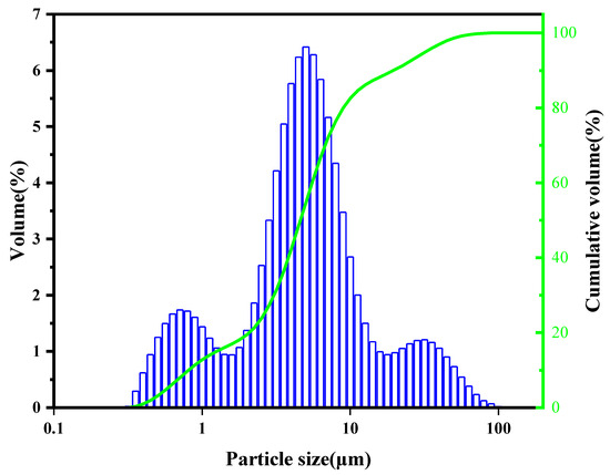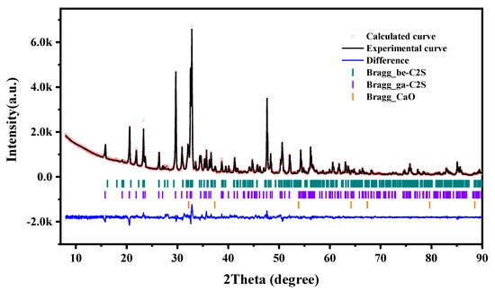 The particle size distribution of the synthesized γ-C2S powder was determined using a Malvern Mastersizer particle size analyzer. The results are illustrated in Figure 2. The d50 and d90 of γ-C2S powder were 5 μm and 20 μm, respectively. The clinker underwent quantitative analysis using the XRD Rietveld method to confirm the purity of the synthesized γ-C2S (given in Figure 3). Based on the XRD data, the crystal structure of the sample was quantitatively analyzed by the Rietveld method, revealing that the mixture consists of 89% γ-C2S and 11% β-C2S. The negligible presence of calcium oxide and silica in the powder proves the completeness of the solid-phase reaction.